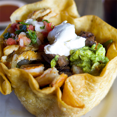 A giant crispy tortilla bowl filled with rice, black beans, roasted corn, grilled onions, and peppers, topped with your choice of grilled chicken, shrimp, or steak. Served with sour cream, guacamole, and pico de gallo for a bold and flavorful meal. chicken 15.00, shrimp 17.00, steak 19.75 or cocina (grilled chicken, shrimp, steak) 21.99
