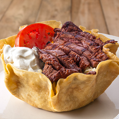 A large, crispy taco shell filled with seasoned ground beef or shredded chicken, topped with cheesy dip, fresh lettuce, sour cream, tomatoes, and shredded cheese. A perfect blend of crunch and flavor. 9.50